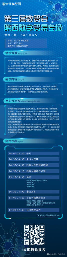 为改变陕西省数字服务贸易现状,把握数字贸易发展新机遇紧抓住RCEP、“一带一路”契机,加速拓展服务贸易、数字贸易朋友圈”,加强与浙江、上海等省市在数字服务产业特别是人工智能、大数据、信息技术服务等领域的优势资源串联,为陕西省服务贸易创新发展提供源源不断的创新动能,决定于2024年第三届全球数字贸易博览会期间举办陕西数字贸易推介会。