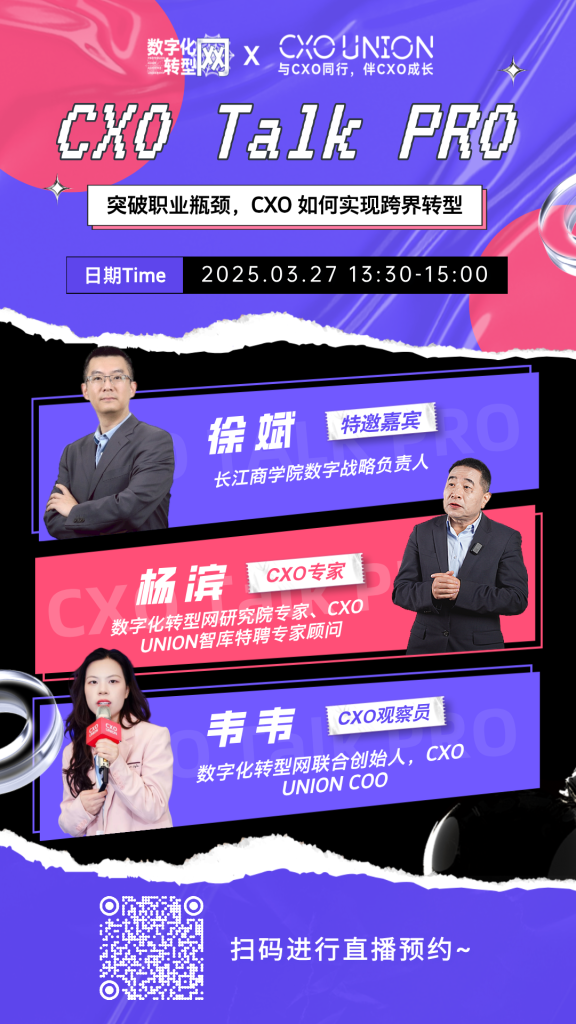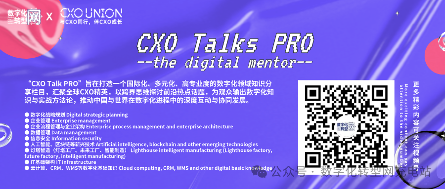 “CXO Talk PRO”线上直播栏目由专业与领先的产业信息服务平台数字化转型网(Professionalism Achieves Leadership 专业造就领导者)联合全球卓越的职业经理人发展平台CXO UNION(与CXO同行,伴CXO成长)发起。